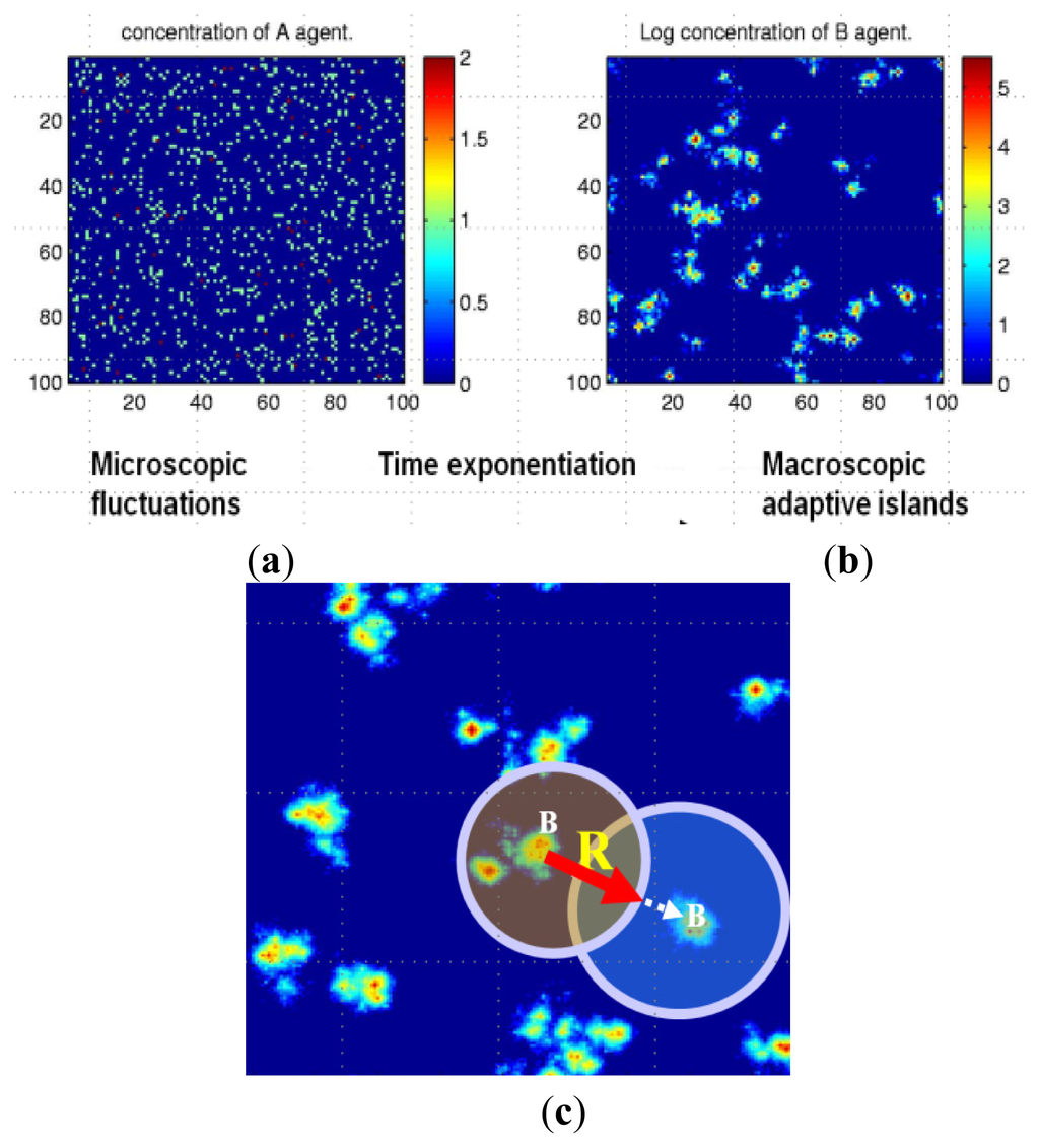 The crucial (linear) term of the logistic equation has a form identical with Equation (1). It was shown in the context of the AB model described below [15] that this term has the capacity to amplify the microscopic local fluctuation as to generate spontaneously macroscopic adaptive collective objects: