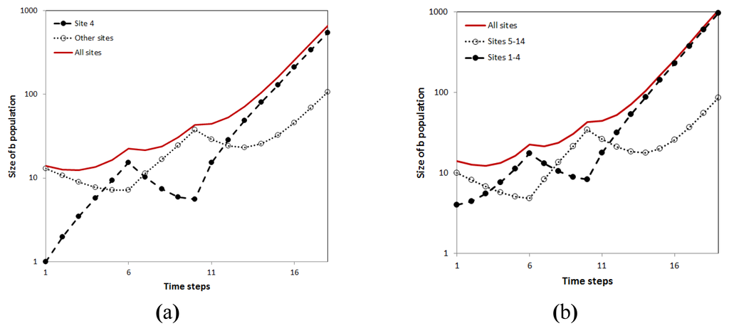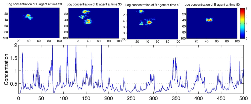 As the A’s are diffusing, the locations with largest a(x,t)’s are moving, disappearing and appearing and so do the terms in the sum Equation (13). The non-trivial effects proved in [15,21] is that the B herds/islands are capable to discover, follow, adapt their position and exploit the fortuitous A fluctuations to such a degree that in 1 and 2 dimensions the B population never dies. This phenomenon has been studied in great detail in various regions of the parameter space and with focus on various mechanisms as described in the following sub-sections.