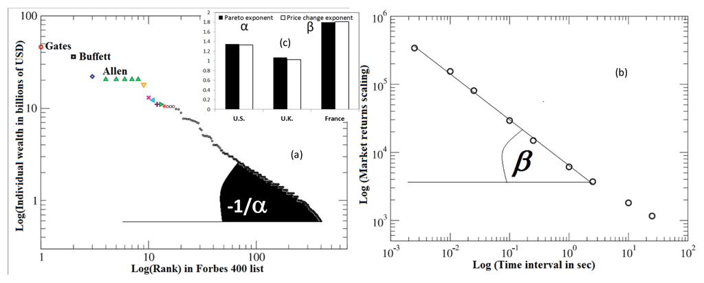In Figure 18, granular structure of individual wealth/capital distribution determines the size distribution of the financial system time fluctuations. Figure 18a represents the granular structure of the wealth distribution in terms of the individual wealth of the wealthiest people in the US (Forbes 400). It is found that it fulfills a Pareto-Zipf power law distribution B(i) ≈ i −1/α where i is the rank of the individual in the Forbes list and B(i) is their wealth. Figure 18b represents the fractal scaling properties of the returns ln [B(t0 + t) / B(t0)] distribution P(ln [B (t0 + t)/ B (t0)];t) ~ t −1/β in terms of the scaling of the height of its peak P(B (t0 + t) – B (t0) = 0;t) ~ t −1/β. Because the integral of the probability is 1, this also measures the dependence of the width of this probability distribution on the time interval: σ ~ t −1/β (note that this does not imply necessarily that the very long tail of the distribution decays by the same exponent [38]). Figure 18c compares the empirical values of the two exponents α and β in three different countries: One finds quite precisely that α= β thereby validating empirically the theoretical predictions of the AB model (or any model (e.g. [36]) with the properties (36–41)).