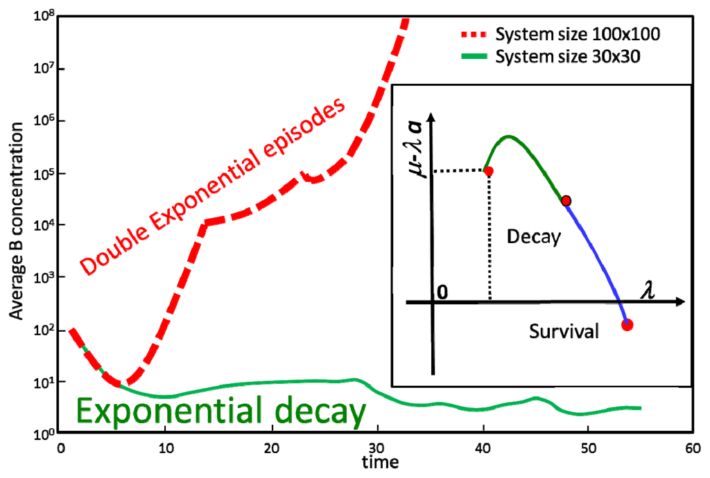 In Figure 2, The inset represents the renormalization flow for a system defined locally by the “bare” constants λ, a and μ. The actual independent combinations considered are λ represented on the horizontal axis and μ – λa represented on the y axis. The initial values for the minimal system size (1 × 1) are represented by the leftmost dot. They correspond to μ – λa > 0, i.e., to B disappearance according to the naïve Equation (12). The coordinates of the second dot represent the effective values of the λ and μ – λa for a 30 × 30 system. The line connecting between the first and second circle represents the renormalization flow of the effective parameters as one increases the size of the system from 1 × 1 to 30 × 30. The third dot represents the effective parameters for a 100 × 100 lattice. One sees that while for 30 × 30 the renormalization group still predicts B disappearance, μ – λa > 0, for 100 × 100 the theoretical prediction is that life wins, μ – λa < 0. The main figure represents the time evolutions of the actual numerical simulations of the AB system. One sees that indeed, as predicted by the theory, the B population decays for the 30 × 30 system (solid line) but survives and grows for the 100 × 100 system (dashed line). Note however the fine structure of the dashed line: “crossing exponentials” separated by cusp discontinuities discussed in the next sections.