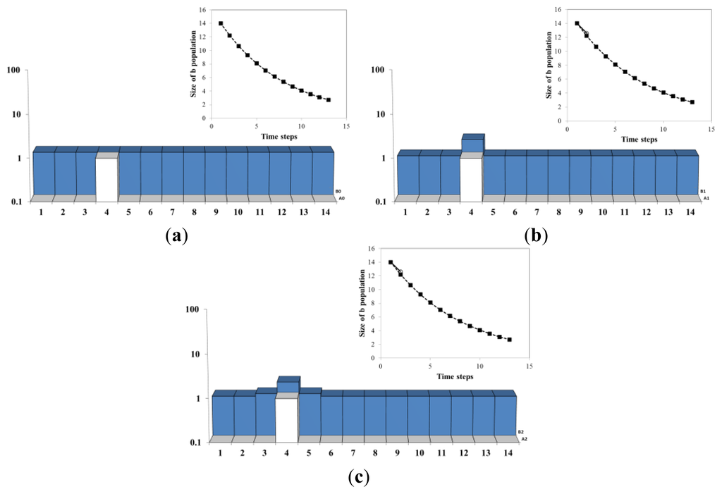 Figure 1 illustrates the evolution of the population in the universe as expressed by the dynamics Equations (2)–(6).