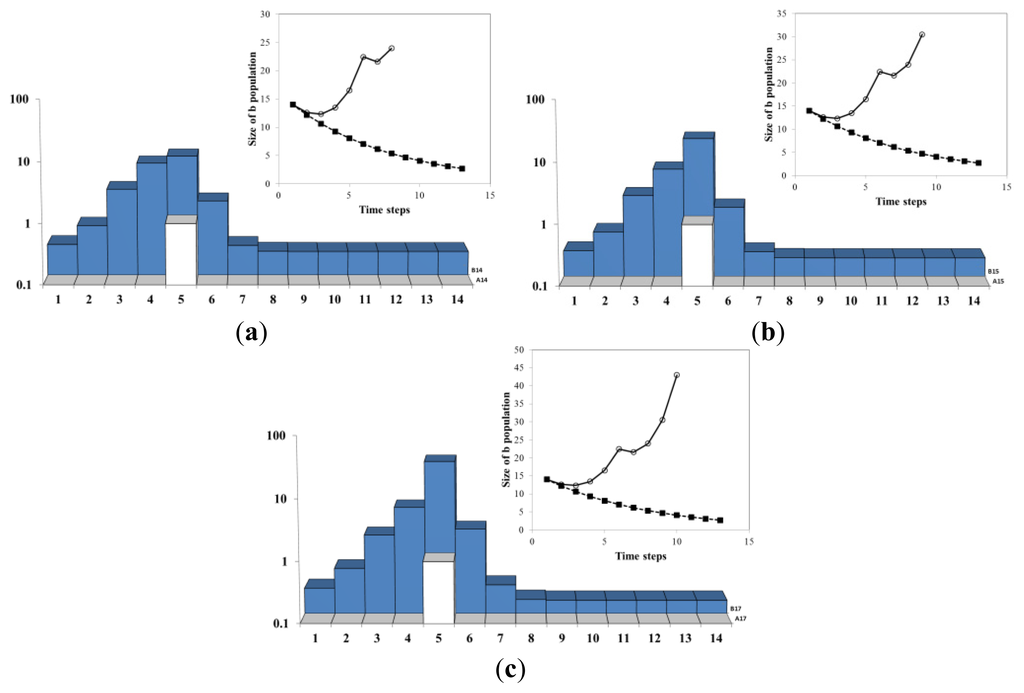 However, the discrete AB model result is quite different. Instead of the monotonous exponential, it displays even for λa < μ a quite lively and thriving B population. The B’s in the (7)–(9) model self-organize spontaneously in herds/island-like spatial structures. This is related with the dictum by Phil Anderson [20]: