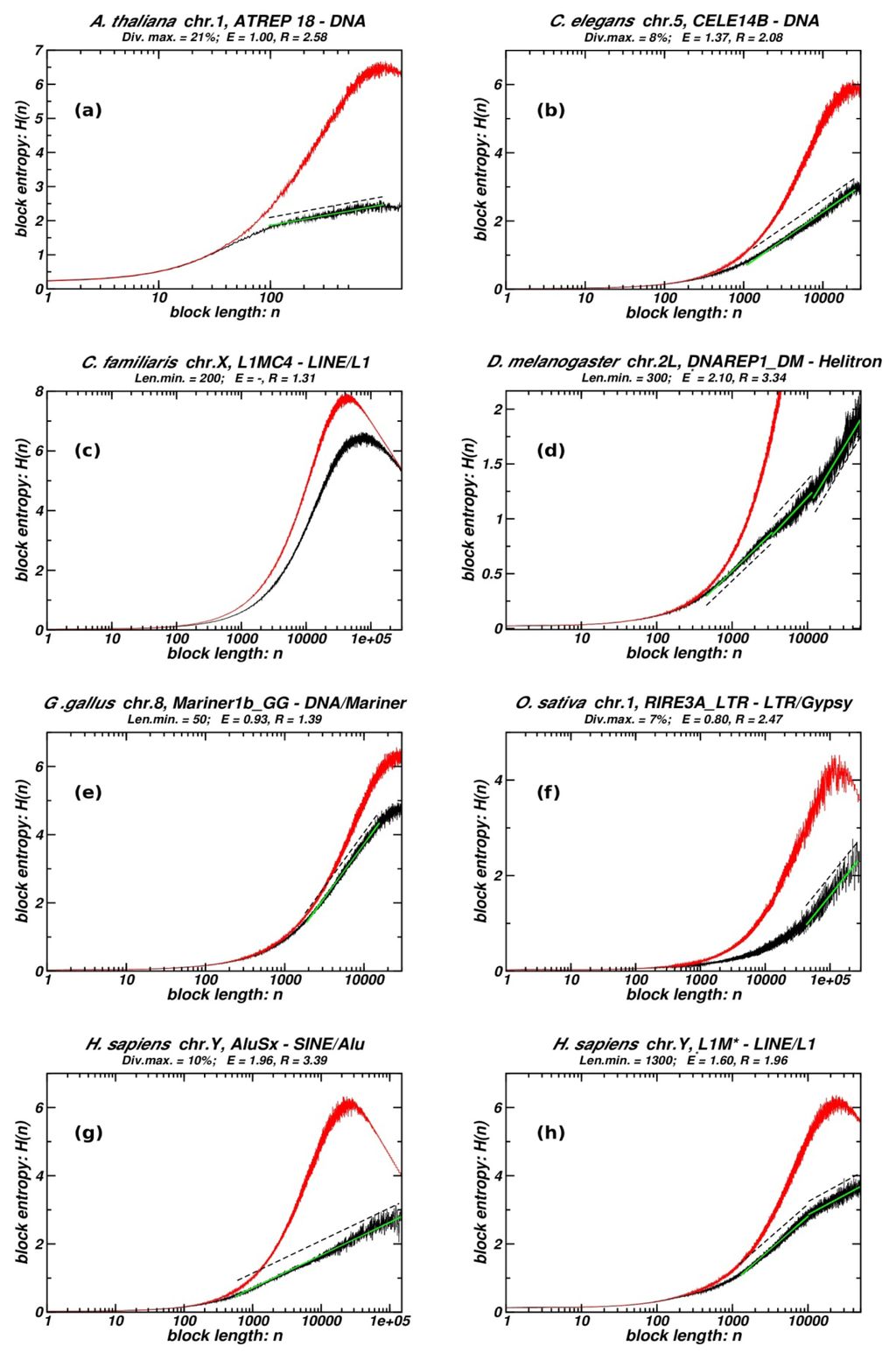 In Figure 1, we present examples of H(n) plotted versus n for chromosomes from different organisms. The full list of examined cases is given in Table 1. Most cases of well-shaped fractality are found in small genomes (A. thaliana. C. elegans, D. melanogaster, O. sativa). However, small genomes have relatively low populations of repeats, usually of the order of tenths per chromosome for every repeat type. Thus repeat populations suitable for our analysis are scarce in small genomes. All these cases (relatively few, see Table 1) present a well-shaped linear region and high values of R indicating an entropic scaling compatible with fractality in the chromosomal distribution of repeats. On the other hand, in large genomes (the large majority of eukaryotic ones) the occurrence of important linearity in the entropic scaling is scarce, and is relatively frequent only in the human genome, which is well known for large populations of highly inhomogeneously distributed repeats, often following clustering at several length scales [7,10].