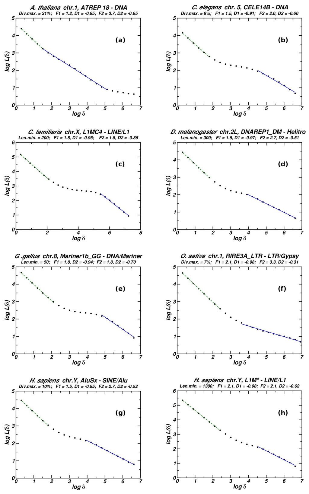 Notice that for a genomic TE distribution two linearity regions are observed in most cases: one in the low-length region related to the length of the studied TEs and one in the high-length region. The latter is the only one for which the slope is found to significantly deviate from −1 (in the cases showing fractality).