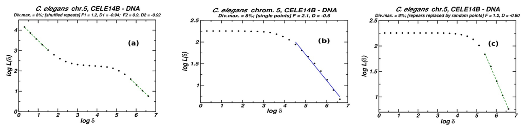 The related quantitative information for these manipulated (surrogate) genomic sequences is given in Table 2. In Figure 3 the three plots for the chromosomal distribution of the DNA transposon CELE14B in chromosome 5 of C. elegans (row 6 in Table 2) are depicted. The full set of the plots corresponding to the manipulations above is given in the supplementary material. The inclusion in our study of the box-counting analysis based on the surrogate data sets (a), (b) and (c) leads to the conclusion that the linear segment in log-log plots, always found in the low-length region, relies on the size distribution of the repeats themselves. As this size distribution is short ranged (all repeats being more or less truncated copies of the same ancestral sequence, see e.g., [8]) it lacks any trace of fractality, as shown by the corresponding absolute slopes (see the D1 values in Table 1), which are always near-unity.