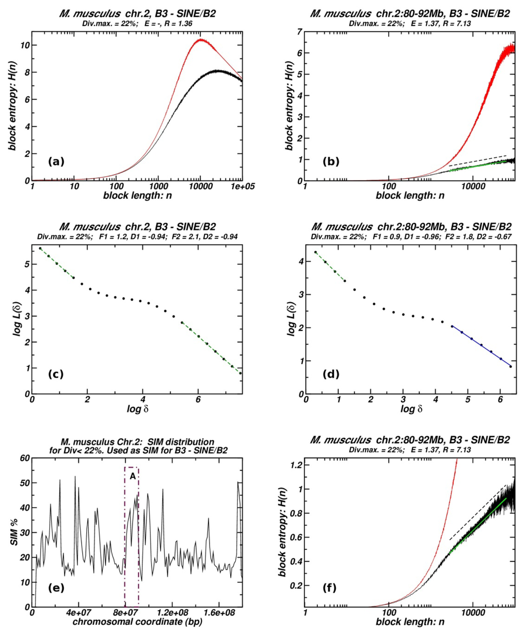 We apply the block entropy scaling and box-counting methodology to four chromosomal regions from chromosomes which, as a whole, do not present indications of fractality. The criterion for selecting the chromosomal regions was a relatively high percentage of repeat insertions which occurred after the proliferation of the examined TE population. In all four cases both methods of entropic scaling and box-counting show well developed fractality. The plots of these chromosomal regions are given in the supplementary material while one such case is presented in Figure 4.