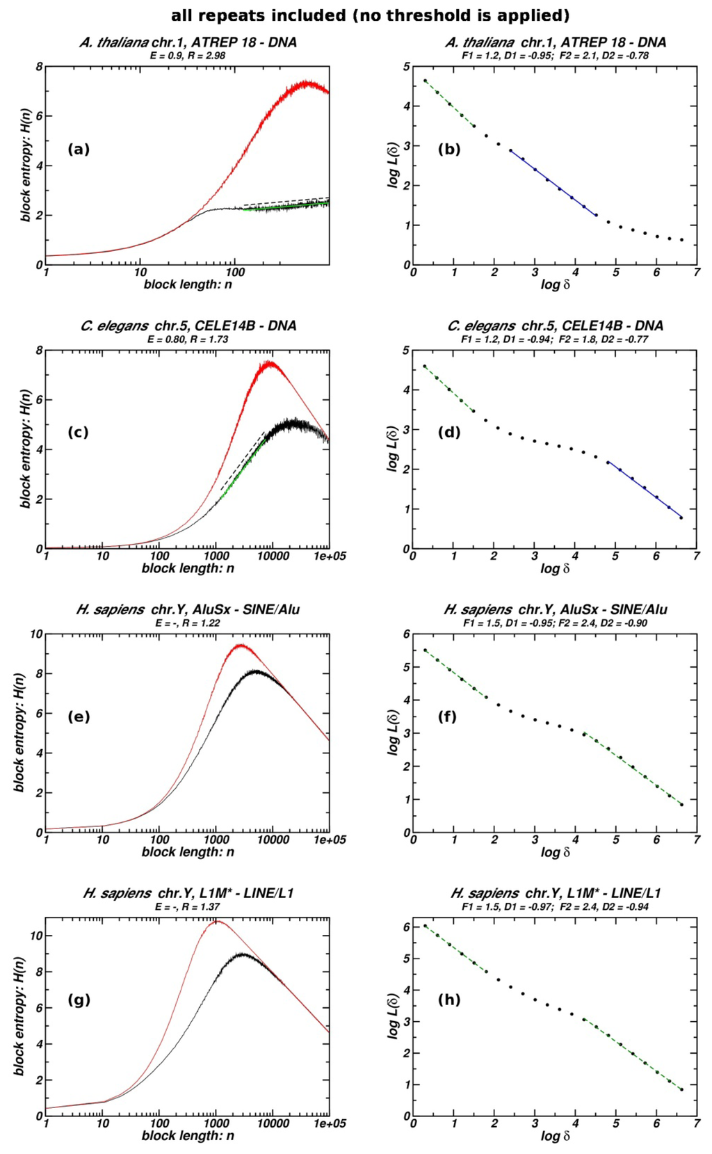 The repeat populations (of several TE types) per chromosome studied and listed in Table 1 are the ones where heavily deteriorated or truncated repeat copies are excluded, as explained in the Methods. Preliminary tests have shown that the adoption of threshold values for Divmax or Lenmin, which are found to optimize the extent of linearity in log-log scale in the inter-repeat distance distributions [10,11], is also efficient for the study presented herein. In order to assess the impact of such thresholds in our study, we analyse the entropic scaling and box-counting in four cases from Table 1. In Figure 5 we present plots for the whole TE populations, and in Table 3 quantitative results are shown along with the corresponding quantities when thresholds excluding deteriorated and truncated copies are imposed