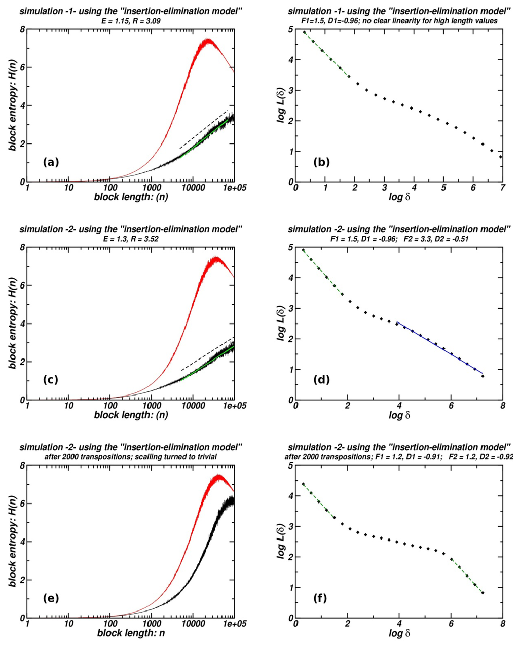 3.5. Entropic Scaling and Box-Counting for Sequences Produced Using the “Insertion-Elimination Model”