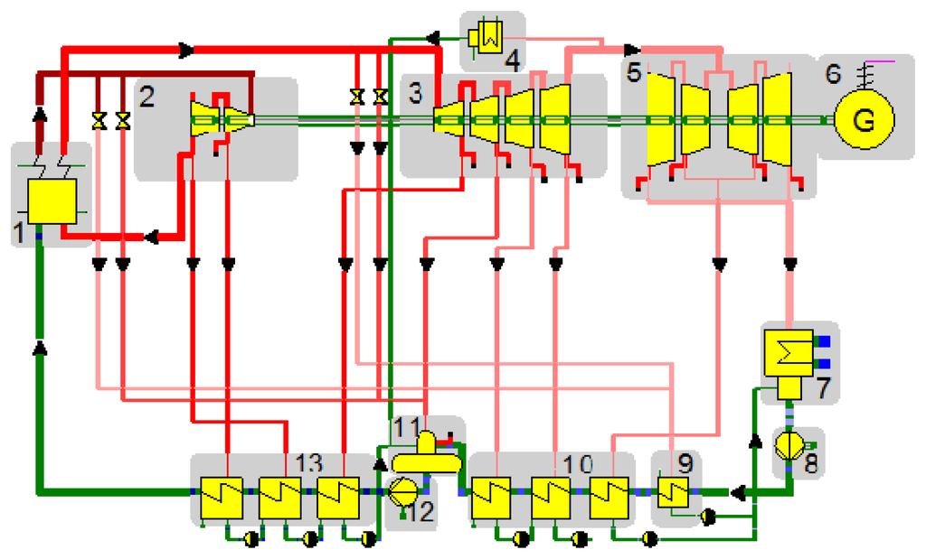 Using the data obtained above, a process model is simulated using EBSILON PROFESSIONAL software to carry out the off-design calculation of the power generation unit (Figure 10) [23].