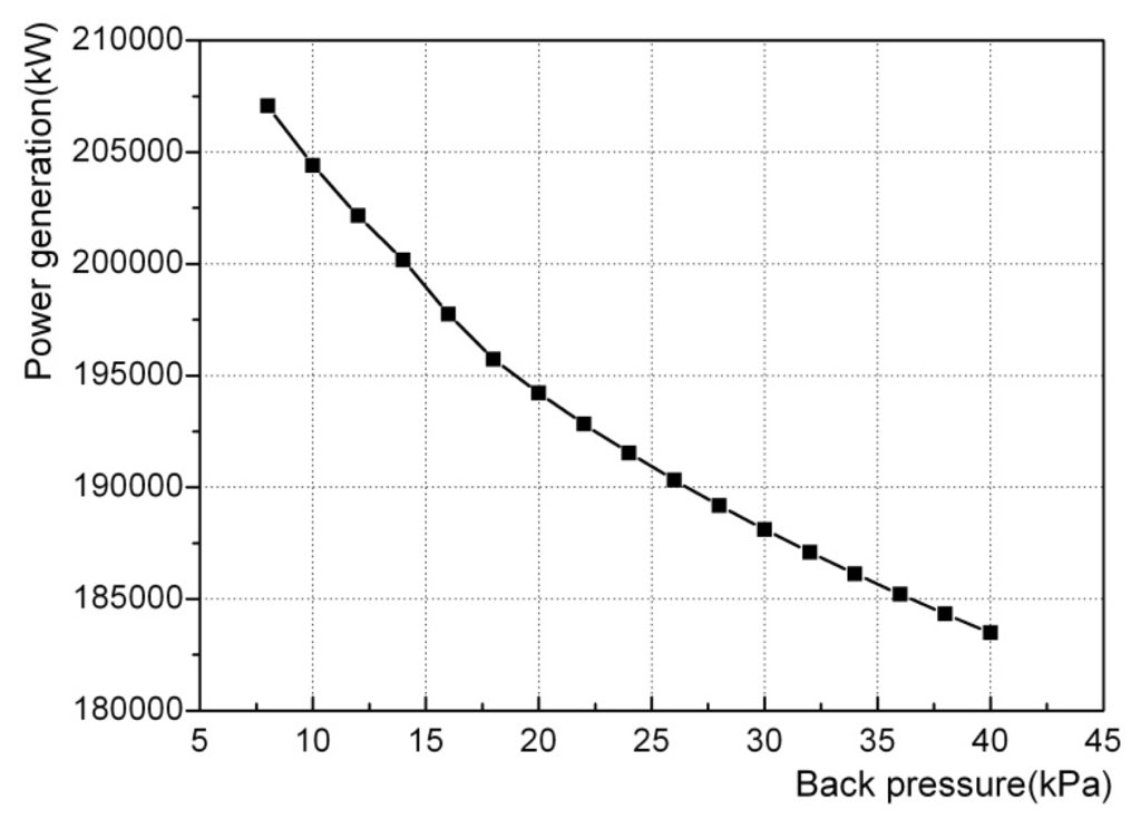 Two main measures have been employed for these problems. First, to conserve water, the air-cooled power unit has a well-developed design, in which the blades of the final stages are not very long. This feature makes it easy to operate the large-scale turbine at a relatively high back pressure. Second, as mentioned in Section 3.1, recently developed distributed variable frequency pumps can now reduce the power consumption of the heat grid [18]. This type of heat grid system is capable of solving operation problems and adjustment difficulties for the direct grid. Therefore, the main technical problems related to the development of the LVM with a large CHP unit and heat grid have been solved. The present study presents a typical design and analysis model of the large-scale LVM (Figure 3). Furthermore, the off-design calculation when the back pressure of the turbine increases is carried out by the system simulation with the same software as the ECM (Figure 12). There is no sliding pressure in the condenser following the change of heat load, and the flow of the primary grid is adjusted with the heat load. Therefore, the power generation of the CHP unit for this case with LVM is constant at 190,169.8 kW.