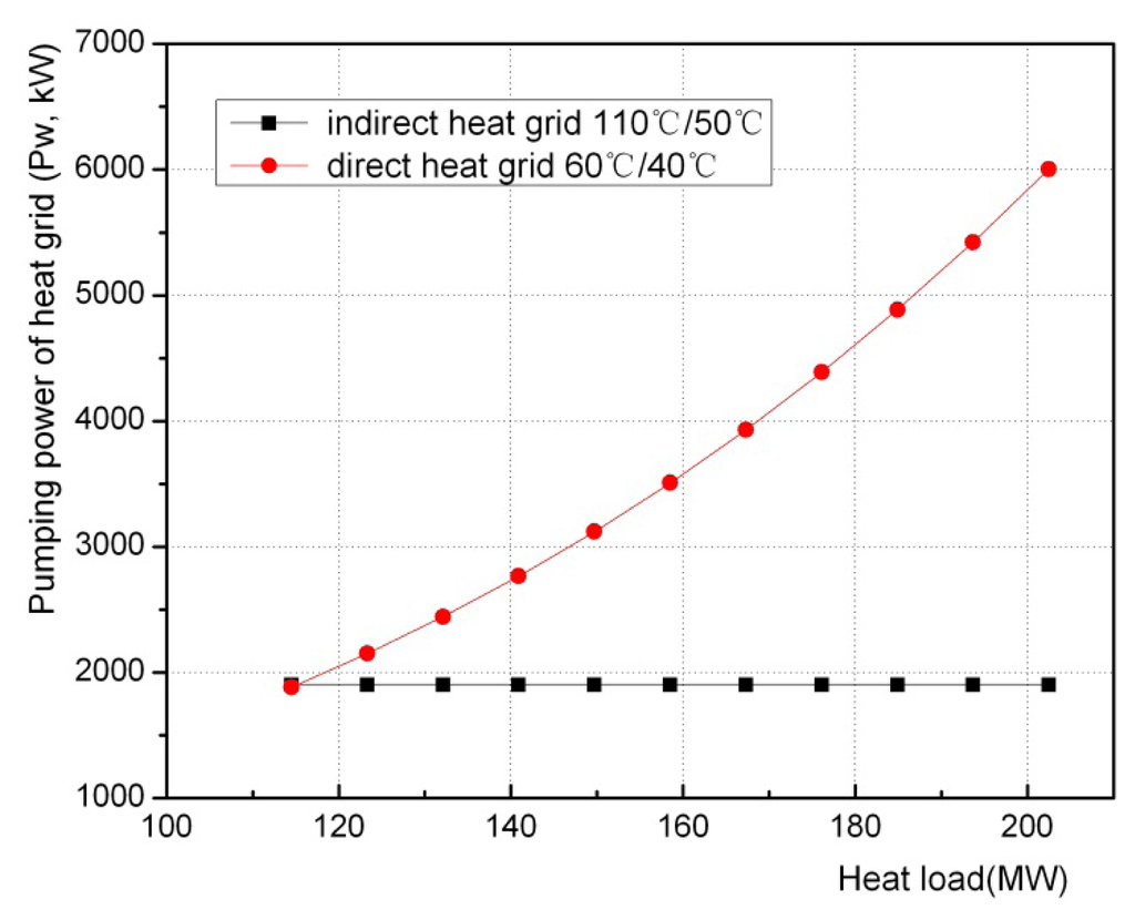 The secondary and primary grids have somewhat similar calculation principles; however, that of the secondary grid is more complicated because different buildings with different heights and distribution conditions have varied calculation results. In the case studied, the pressure drop of the secondary grid is uniformly assumed to be 0.2 MPa [17]. The primary circulating pump is placed at the power plant, and each thermal station has a secondary pump in the secondary grid, with all efficiency rates assumed to be 70% [18]. Using Equation (2), the power consumption (Pw) is calculated to be 1,903.2 kW for the entire heat grid, including the primary grid and the secondary one. The mass flow is constant when the heat load changes with the outdoor temperature, and thus, the heat grid power is also constant. This is expressed as: