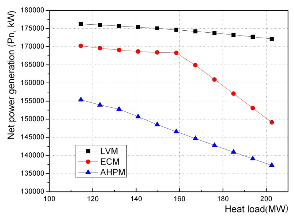 The LVM and AHPM have the ability to supply a larger heat load compared with the ECM, which is limited by the minimum cooling flow of the low pressure cylinder.
