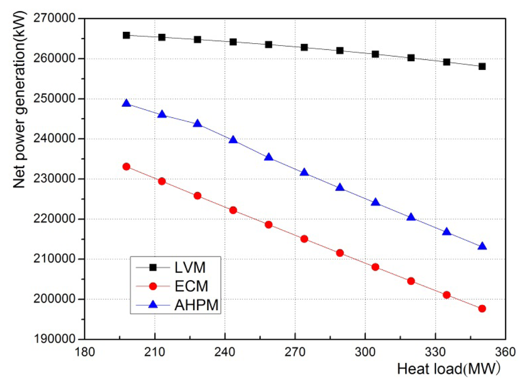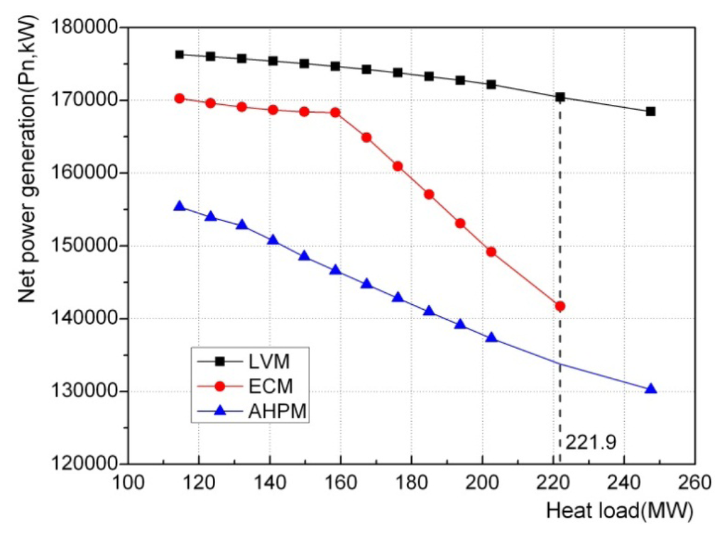 Table 5 shows the power generation of three heating modes at the design condition. The off-design results are shown in Figure 15. Overall, the net power of the LVM is the highest, whereas that of the AHPM is the lowest for the 200 MW unit studied. In order to get a more general conclusion, a similar case with an air-cooled 300 MW unit is studied with its result, as is shown in Figure 16. For the 300 MW unit studied, the AHPM has a lower fuel consumption level than the ECM, but the LVM is still the preferred selection in application. Therefore, it’s safe to conclude that the large-scale LVM should have a priority in the development of 200 MW/300 MW based CHP in future. With respect to AHPM and ECM, the fuel consumption level depends.