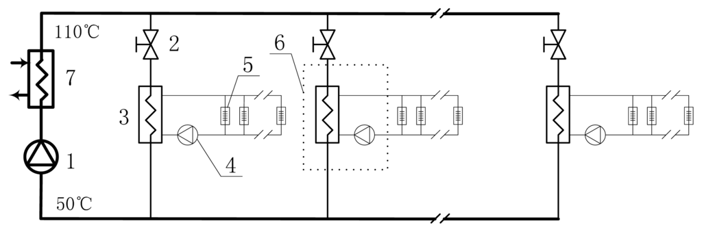 - Chen, M. Heat-supply system with distributed variable frequency pump. Gas Heat 2008, 28, A12–A14. (in Chinese). [Google Scholar]