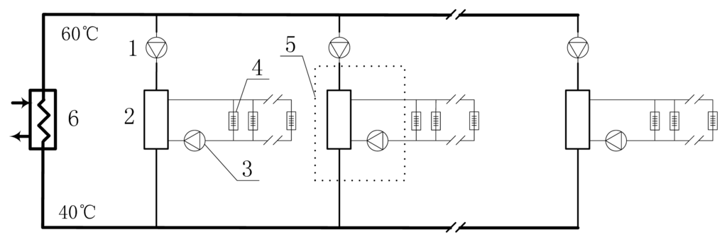 There are two main types of heat grids: direct and indirect [13]. With the branched two-pipe system in the current study, the direct heat grid is applied in the LVM, and the indirect heat grid is employed in both the ECM and the AHPM. The structures of the two grids are different and can be found in Figure 4 and Figure 5. As the conventional type of grid, the indirect one is extensively used in large-scale heating networks, while the direct grid is more common in small-scale heating networks with LVM. A large-scale direct grid should use distributed variable frequency pumps to overcome the unavoidable hydraulic disorder problem in a conventional heating grid.