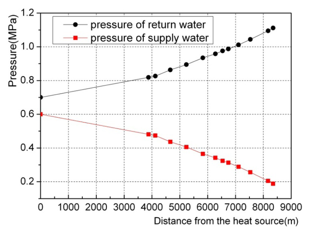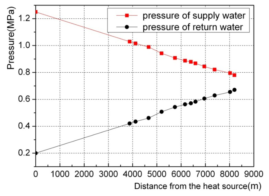As shown in Figure 5, in the direct heat grid, the primary and the secondary grids are directly connected by a mixing tube with no heat exchangers. The designed primary grid temperatures of the supply and return water are 60 °C and 40 °C, respectively. Although the calculation principle of the direct heat grid is the same as that of the indirect heat grid, the distribution of the pumps for the direct heat grid is different from that of the indirect heat grid. The primary direct grid lacks a primary circulating pump, which is normally used to push water with a high pressure. As the variable frequency pumps are distributed at every thermal station to fetch water, the throttling phenomenon at the stations close to the power plant is avoided [19]. With the same assumptions as those for the indirect heat grid, the pressures along the primary flow circuit of the farthest loop are illustrated in Figure 7.