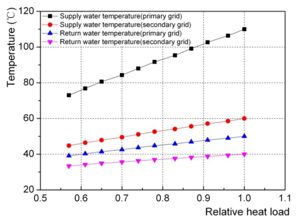 The outdoor temperature is obtained from the conventional designing data, and the relative heat load (Q̄) is obtained by Equation (3) [14]. For a different relative heat load, the water temperature of the secondary and primary grid can be obtained according to the relevant literature [21], as shown in Figure 9.