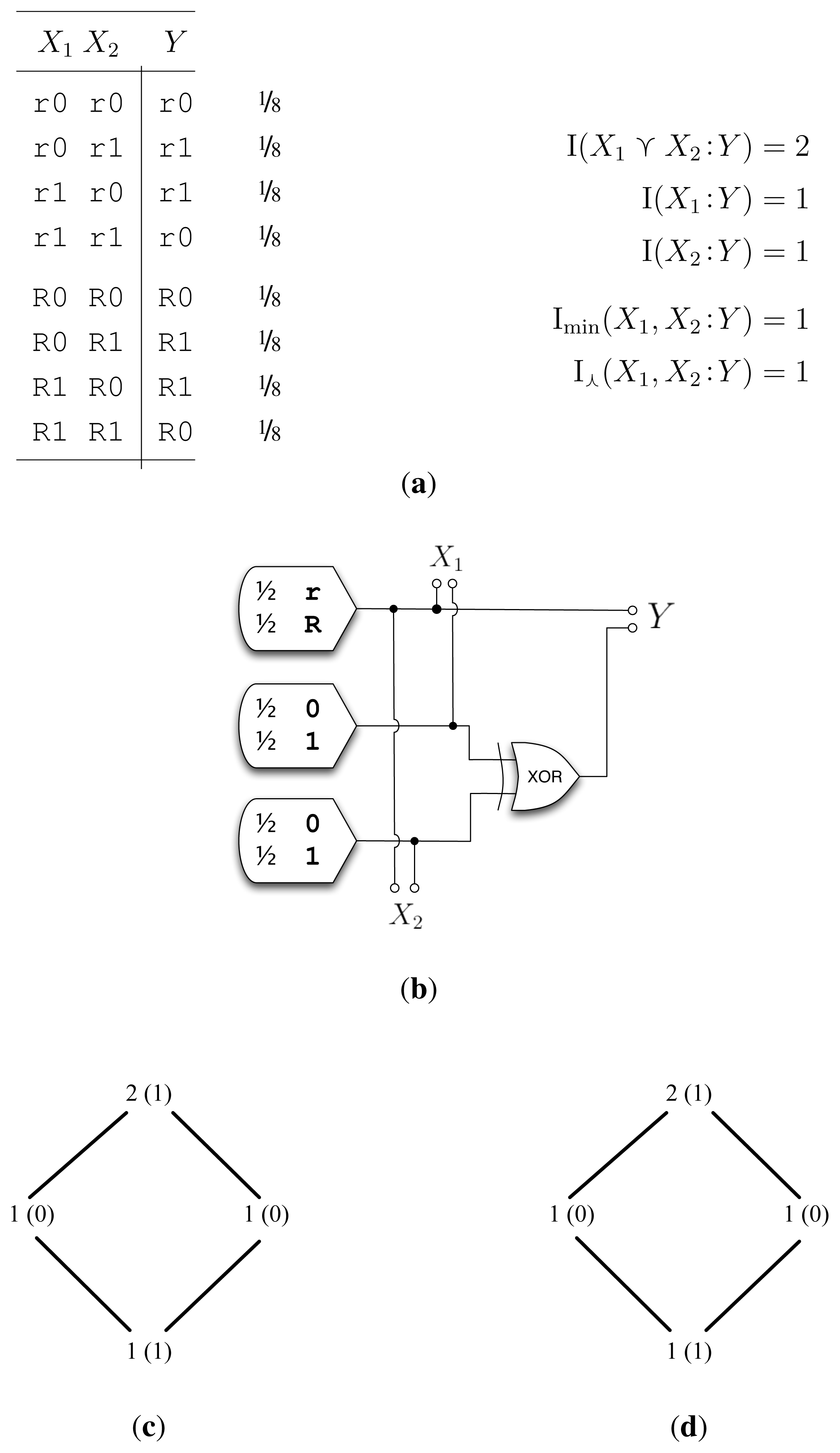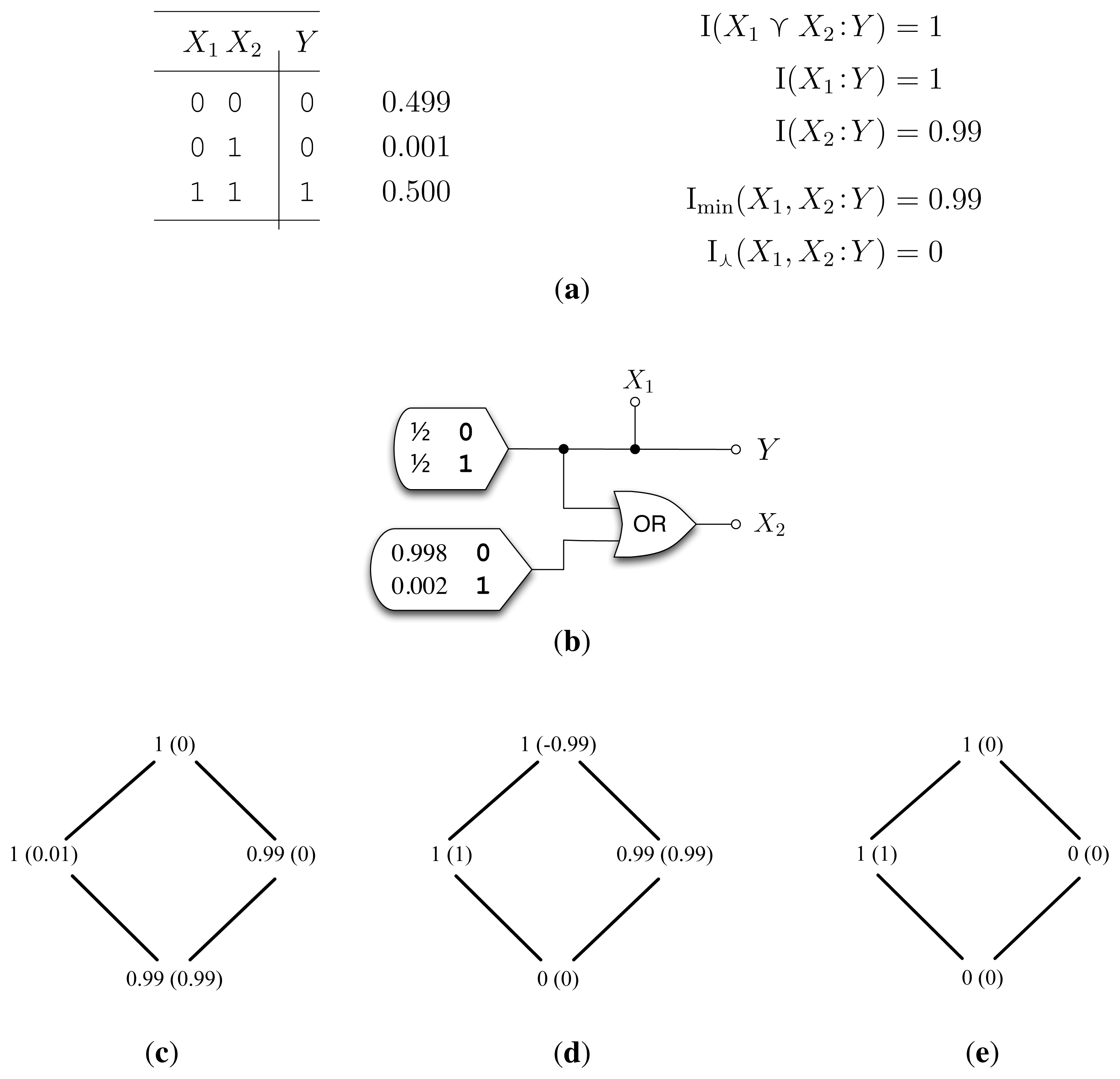 (GP) follows immediately from the nonnegativity of the entropy. (Eq) follows from the invariance of entropy within the equivalence classes induced by ≅=. (TM) follows from the monotonicity of the entropy with respect to ≼. (M0) also follows from the monotonicity of the entropy, but now applied to ⋏iXi ⋏ W ⋏ Y ≼ ⋏iXi ⋏ Y. If there exists some j, such that Xj ≼ W, then generalized absorption says that ⋏iXi ⋏ W ⋏ Y ≅= ⋏iXi ⋏ Y, and thus, we have the equality condition. (S0) is a consequence of the commutativity of the ⋏ operator. To see that (LP0) is not satisfied by the , we point to the example, Subtle (Figure 4), which has negative synergy. One can also rewrite (LP0) as the supermodularity law for common information, which is known to be false in general. (See [8], Section 5.4.)