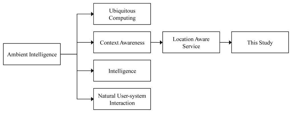 AmI can be roughly divided into four categories – ubiquitous computing, context awareness, intelligence, and natural user-system interaction (see Figure 1). This study aims to explore a particular topic in context awareness – location-aware services (LASs). A LAS is a special context-aware service (CAS) that utilizes the location of a user to adapt the service accordingly [5]. Dialing an emergency number from a cell phone, car or marine navigation systems, and package tracking systems are typical LAS examples. Krevl and Ciglarič [6] proposed a framework for developing location-based distributed applications. The framework comprises of three layers – the client layer, the application/server layer, and the database layer. According to Park et al.’s opinion, it is not easy to provide LASs because of latency, limited display, and intermittent connectivity to the backend database [7]. Nevertheless, according to Zickuhr [8], until 2012 about three-quarters of smartphone owners have used LASs. The mobile 911 service, mentioned in Zhu et al. [9], sends a request to find medical helps for those in the immediate vicinity. Aalto et al. [10] established a LAS system for delivering permission-based location-aware mobile advertisements to a user’s cell phone using Bluetooth positioning and wireless application protocol (WAP) push. Aittola et al. [11] provided a LAS to guide readers in a library to books and collections they may be interested in. Similarly, Bohnenberger et al. [12] implemented a LAS system that gives a shopper direction through a shopping mall. The reasoning was based on three factors: the types of products that the shopper was interested in, the shopper’s current location, and the purchase history of the shopper.