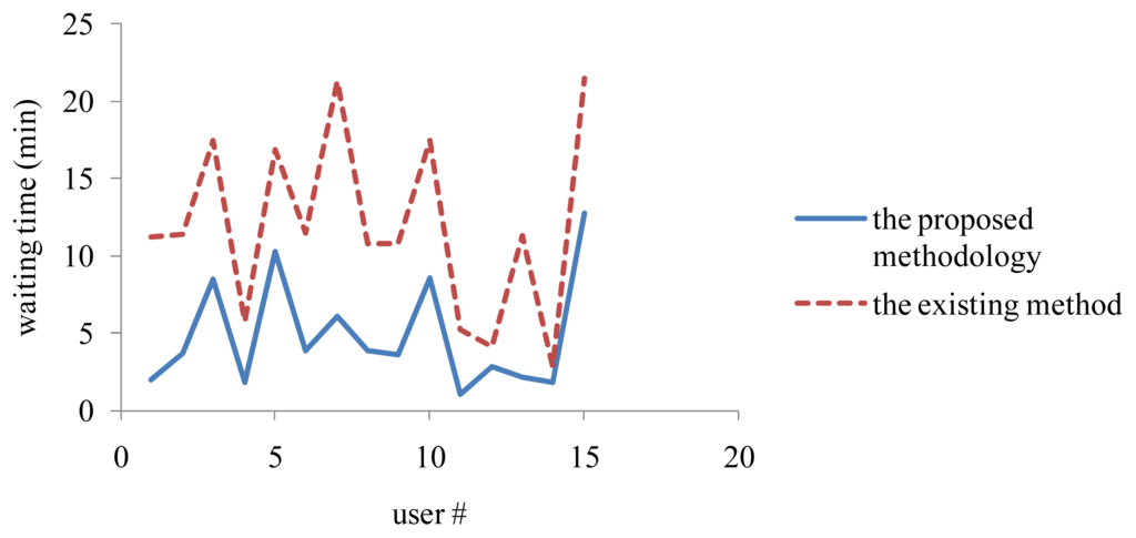 The experimental region was abstracted into a traffic network, as shown in Figure 10. Fifteen users, starting from various locations to the same destination but with unequal speeds, sent their requests through their cell phones to the system server to order food from the six shops. The collected data were summarized in Table 10. The recommendation results and performances were shown in Table 11. The existing LAS system usually recommends a user to the nearest service location via the shortest path. So, we also estimated the waiting times of users if they were guided in this way. The average waiting time of users using the proposed methodology and the existing LAS system are compared in Figure 11. On average, the waiting time of users could be reduced by 60% using the proposed methodology.