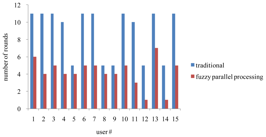 Subsequently, to assess the efficiency of the proposed fuzzy parallel processing scheme, the number of rounds required to achieve the optimal solution was recorded for each user, and compared with that using the traditional non-parallel-processing method. The results were summarized in Figure 12. As it can be seen, much fewer rounds were required to achieve the optimal solution using the fuzzy parallel processing scheme, which supported its validity as a means of accelerating the recommendation process.
