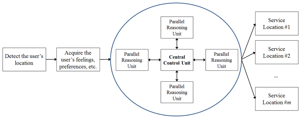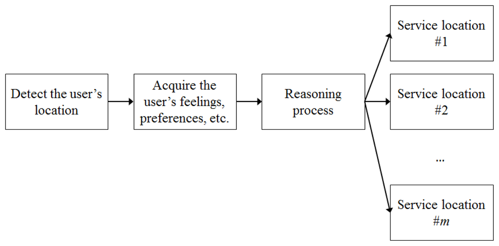 Users in a dynamic environment may encounter unexpected events, leading to some needs that must be met. How the environment supports this is the goal of ambient intelligence (AmI). AmI is a vision in which an environment supports the people inhabiting it in an unobtrusive/transparent, interconnected, adaptable, dynamic, embedded, and intelligent manner [1,2]. For example, a user may need an AmI system to provide him/her information, such as the nearest parking space [3]. Sometimes, a user needs an AmI system to help him/her make a decision, such as choosing the right restaurant for lunch [4]. After obtaining and analyzing a user’s needs, an AmI system responds the required information or answer to the user through a variety of channels, such as voice prompts, screen messages, eco-feedback, and others.