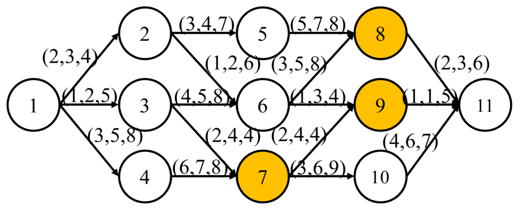 An illustrative example is given in Figure 5, in which the travel time of each path is estimated with a triangular fuzzy number. In this example, there are three service locations: nodes 7, 8, and 9. Assume p̃ = (16, 18, 23); tc = 0. The available times of the three service locations were summarized in Table 2.