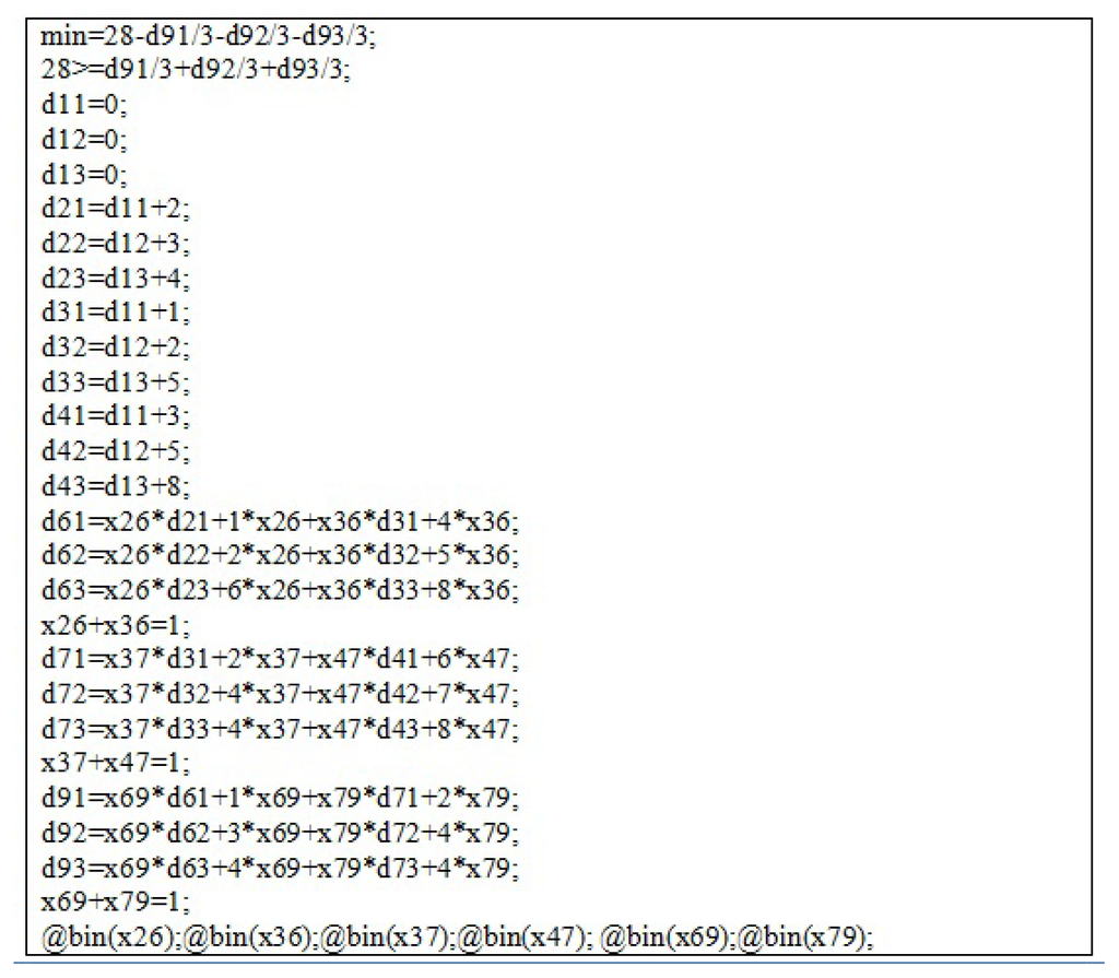 First, the fuzzy dynamic just-in-time path to each of the three service locations is to be found. Take service location 3 (node 9) as an example, the Lingo codes for finding the fuzzy dynamic just-in-time path to this service location are shown in Figure 6. The optimal objective function value is 12.33. The fuzzy dynamic just-in-time path to this service location is 1->4->7->9. In the same way, the fuzzy dynamic just-in-time paths to the other service locations have been obtained, and were summarized in Table 3. In this example, the fuzzy dynamic just-in-time service location is node 8.