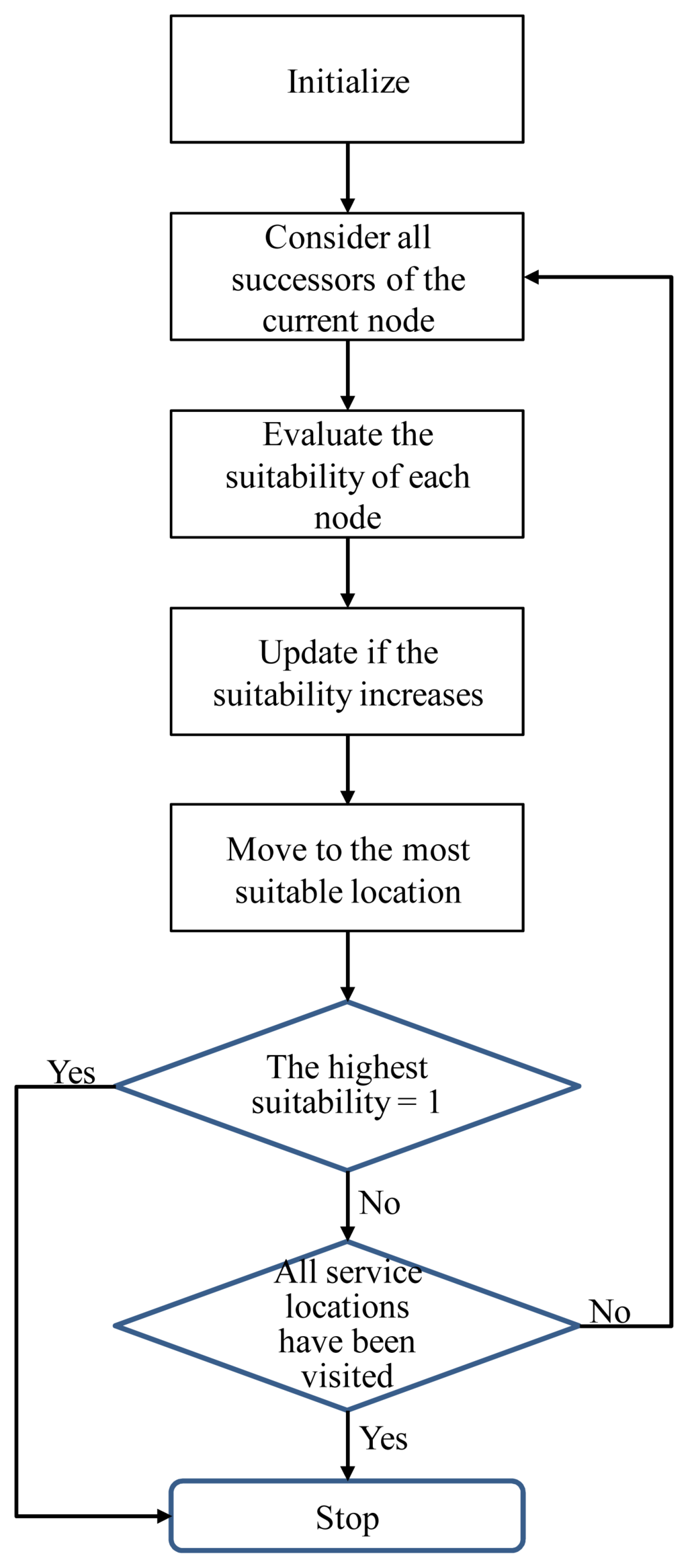 (Parallel operation) If there is no unvisited service location on the path from the current node to the start location, go to step (4); otherwise, consider all predecessors of the current node. For each predecessor, calculate the distance and evaluate the suitability. Update the suitability if it increases.