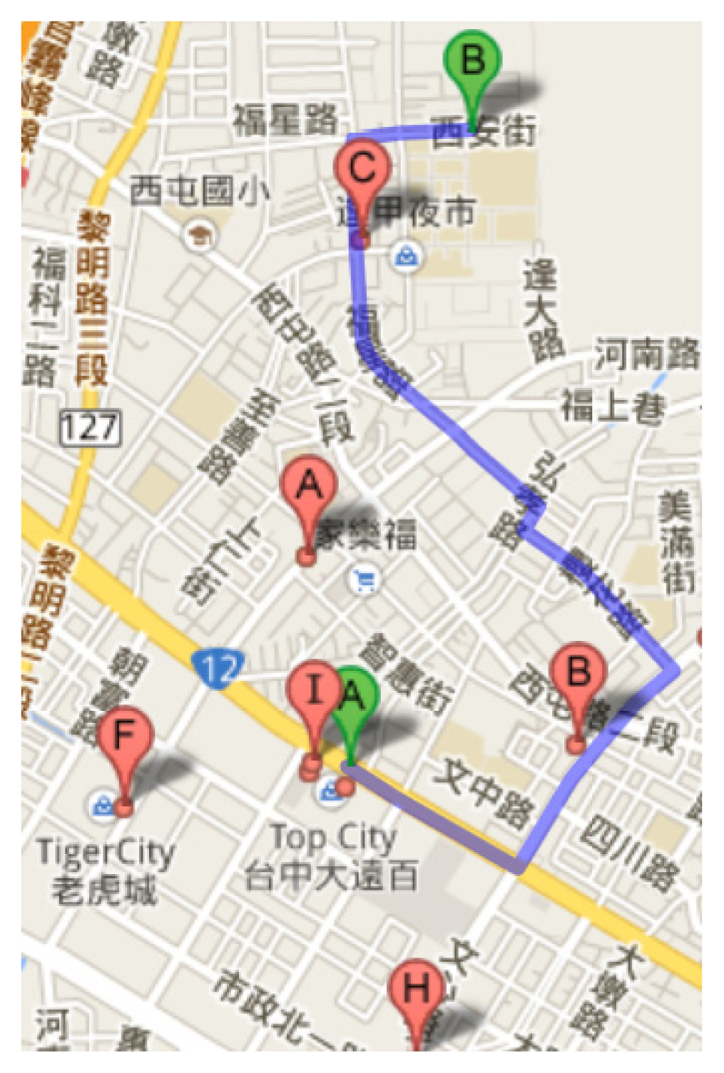 To further elaborate the effectiveness of the proposed methodology, an experiment has been carried out. The experimental region (see Figure 9) is located in the Seatwen District, Taichung City of Taiwan, with an area of 16.88 km2. The six stores of a fast-food chain (indicated with red pins in Figure 9) constitute a ubiquitous service network. These stores are equipped with drive-through facilities that are expected to provide instant services to drivers. However, in real situations, most drivers have to spend 5~25 minutes on waiting, ordering, and payment. Ordering by cell phones is expected to eliminate some of the processing and waiting time; however, more improvements are still possible.