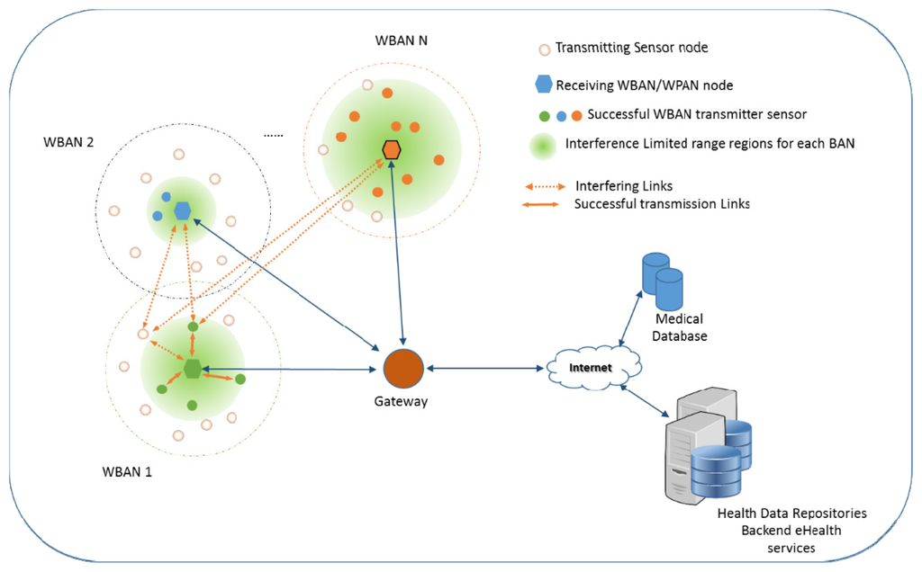 Wireless biomedical networks serve as the transport mechanism among devices or between devices and traditional backbone networks allowing the transmission of health related information [3]. In this type of networking environment wireless sensing and communication technologies are used to allow acquisition of various bio-signals for subsequent monitoring and analysis [4]. Biomedical body/personal wireless sensor networks have been extensively applied in remote health monitoring and patient care [5,6] allowing wireless, wearable or implanted vital sign sensors to be continuously sampled, such as EEG [7], ECG, SpO2, weight, blood pressure, heart rate[8], etc. Although such kinds of networks share many similar properties with general-purpose wireless networks, many domain specific challenges (related to power consumption, transmission range, high degree of reliability, security, etc.) have emerged with respect to specific application domain requirements [9]. A review of applications in healthcare that use wireless biomedical networks and related issues and challenges including interference effect on the network performance is presented in [10]. Today, wireless biomedical communication technologies empower the development of new applications and services to improve the quality of medical care provided to the citizens through ubiquitous healthcare environments [5,6,11,12] raising two crucial issues: (a) RF transmissions can cause electromagnetic interference among biomedical devices, which could as a result critically malfunction or conclude with unsuccessful transmission [13] and (b) different types of electronic health (e-Health) applications and services require different quality of service support [14,15]. It is thus evident that current advances in wireless communication technologies are transforming the delivery of health care. The emphasis is towards personalized and pervasive mobile monitoring focusing on the development of innovative health services to empower individuals in well-being and disease prevention, as well as chronic disease management [16]. These services use a wide range of wireless medical devices and sensors and wireless telecommunication infrastructures to allow ubiquitous remote biomedical monitoring [17–20].