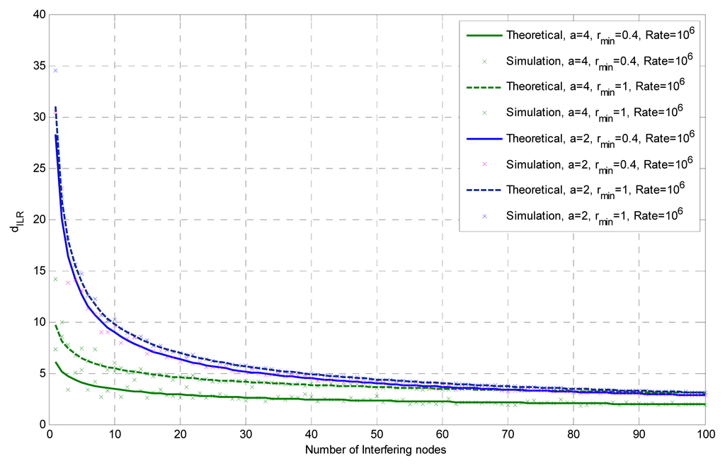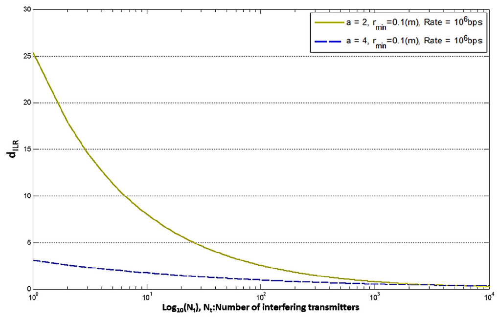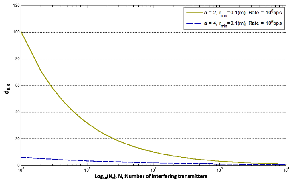 In Figure 3 we see that the theoretical value of the dILR is a decreasing function of the number of interfering nodes and asymptotically falls to zero. When we have a high value for the path loss exponent (a > 2), we see that we obtain lower values for the dILR, when the number of transmitting nodes is relatively small. As Nt increases, the rate of convergence of dILR to zero is: for a = 2 and for a > 2.