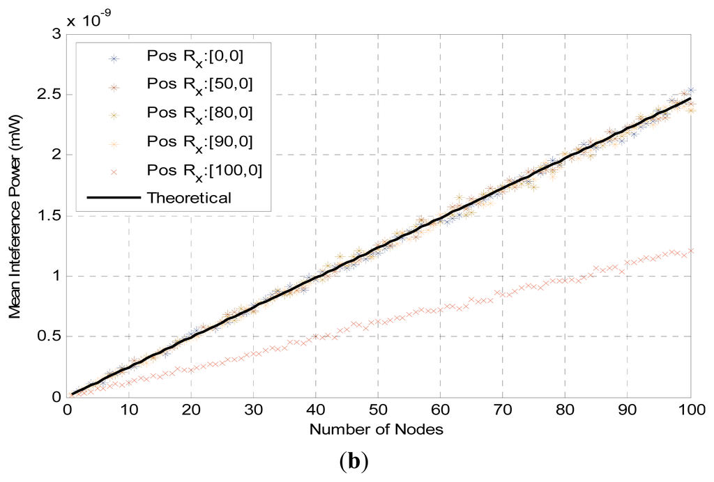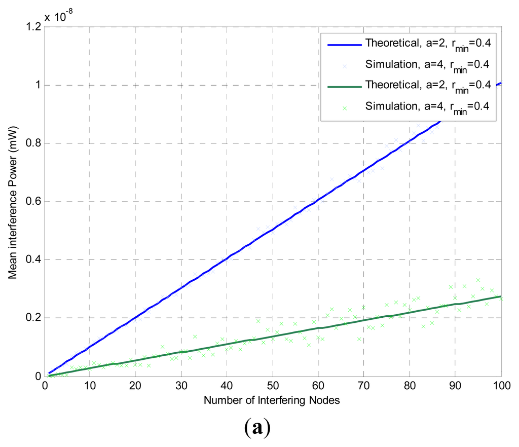 Our interference simulation experiments are presented in Figure 5. We compare our simulation results with the theoretical values calculated using Equations (4) and (5). The number of the interfering nodes increases from 1 to 100. All nodes are randomly placed (using uniform distribution) inside a circular area bounded by the circles with rmin and rmax = 100 m. The receiver of interest is positioned at the center of the area where the highest amount of interference is exhibited. The transmission power is assumed the same for all transmitting nodes and is equal to 1mW. In the simulations we calculate the distance of each transmitting node from the center of the networking area where the receiver of interest is located. Path losses due to fading and shadowing are not considered. The path loss exponent a varies from 2 (free space) to 4 [35]. The channel bandwidth is assumed constant and equal to 107Hz and all transmitting nodes employ a BPSK modulation scheme (thus k in Equations (7) and (8) is equal to 1).