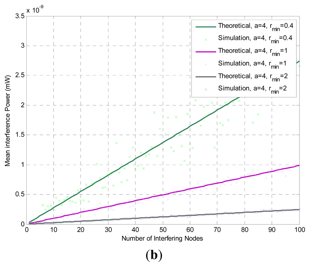 The results from the proposed theoretical model are in a very good agreement with the values of the mean interference levels obtained by simulations. Figure 5a shows the effect of the path loss exponent on interference and Figure 5b shows the effect of rmin (the distance around the receiver where a transmitter cannot be placed, i.e., the exclusion region). As expected a higher value for the path loss exponent results in lower levels of interference, and a larger rmin leads to lower interference.