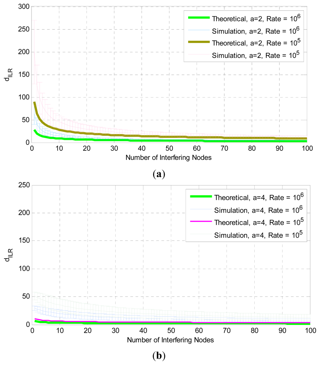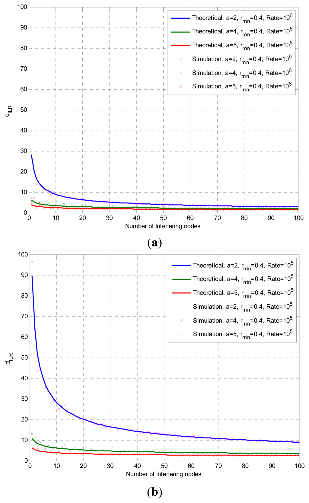 Figure 7 illustrates, the mean interference limited communication range with the confidence intervals (standard deviation) versus the number of interfering nodes, using different transmission data rates, rmin = 0.4 m and path loss exponent equal to 2 and 4 in plots (a) and (b) respectively. By adapting the transmission rate (lowering in this case) we can control the size of the region (enlarge it) and allow more transmitters to be able to successfully communicate with the receiver of interest. This result implies that we can use an upper layer communication parameter to easily adapt (using the proposed method) to the experienced interference. The theoretical and simulation results are in better agreement as the number of interfering nodes increases. We can see that using a higher path loss exponent assumption reveals how much the exhibited interference affect communication and that is the reason that the region is restricted to smaller sizes. We observe (Figure 7) that the theoretical calculations give a lower value (worst case scenario) but are within the deviation interval of the simulation results, for a = 2 (plot (a)), but not for a = 4 (plot (b)). The reason of this discrepancy lies in the way we use the interference measurements to calculate dILR.