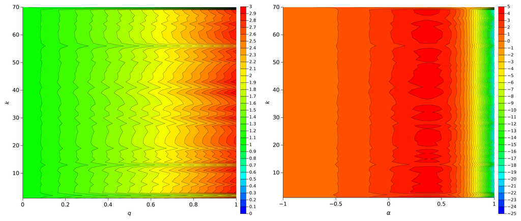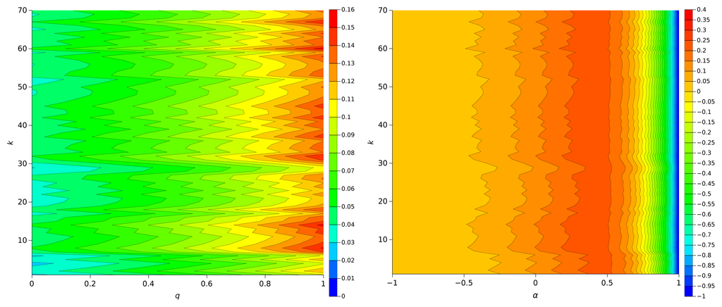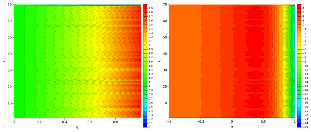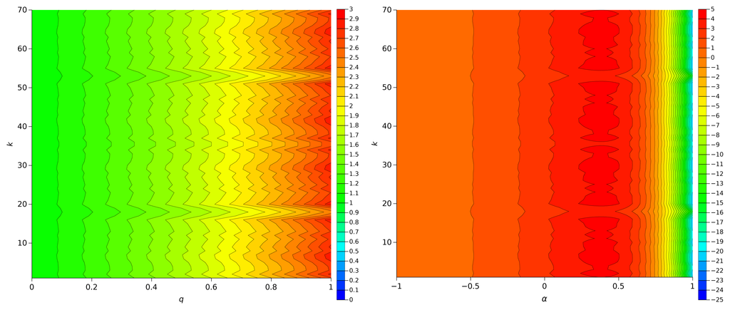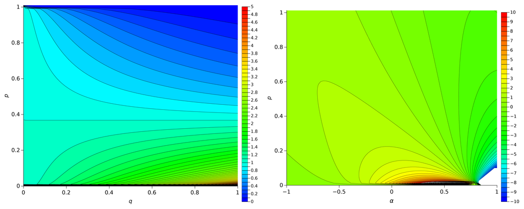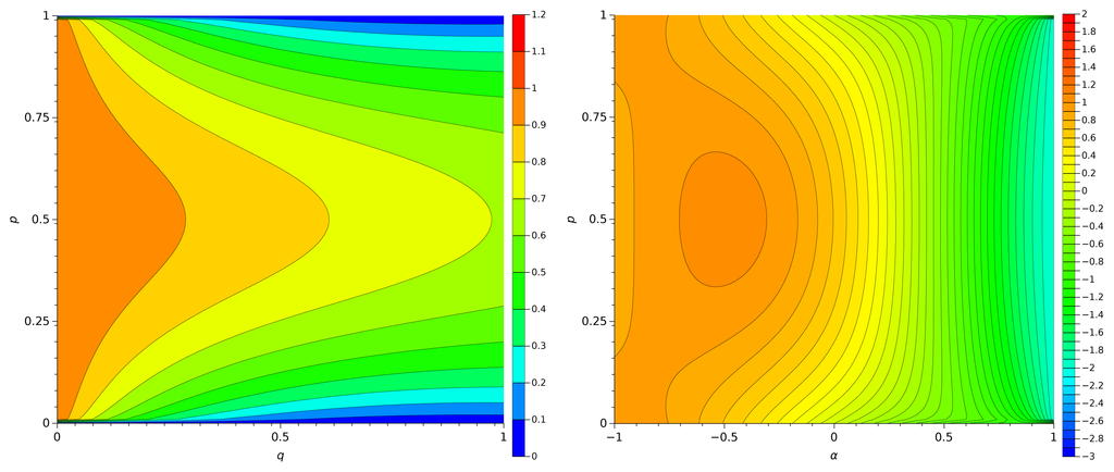 Figure 1 shows the locus of Iq versus (q, p), 0 ≤ q ≤ 1, and Iα versus (α, p), −1 ≤ α ≤ 1. We observe that Iq has a smaller amplitude excursion than Iα. Moreover, we verify that Iα takes not only positive, but also negative values for α > 0. Therefore, Expression (6) assumes also the assumption that we can have negative information, that, for a given value of α > 0, can be interpreted as derived from “misleading events”. While exploring the concept of “deception” is not the objective of the present paper, we should note that related ideas were addressed, in abstract terms, in the scope of negative probabilities [36–41] and, in practical terms, in the scope of robotics [42]. In short, we can say that the parameter α allows us to tune the level of confidence of the information varying from positive (trustworthy) up to negative (deceptive) information.