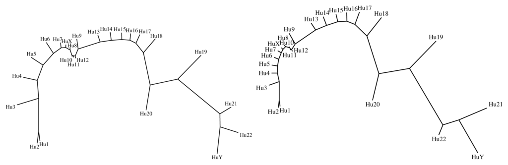 labelled in the sequel as {Pi, Nep, Eul, Cat, Hil, Khi, Gol, Ln2, Ln3, Ln5, St2, St3, St5}. Set consists of the whole set of Human chromosomes labelled in the sequel as {Hu1, ..., Hu22, HuX, HuY}. The irrational numbers are expanded up to 7000 digits and, for each one, groups of two digits feed 102 bins of histograms of relative frequency of occurrence. On the other hand, the chromosome bases are read in triplets feeding 43 bins of histograms of relative frequency of occurrence. In both cases, a comparison n × n symmetrical matrix D of element to element relative distances is constructed, adopting the indices JSDq and JSDα. For simplifying comparisons all distances were converted to the interval between zero (minimum distance) and one (maximum distance). The results are visualized by means of Phylip [48,49] (plots using options “neighbor” and “drawtree”), a package of programs for inferring phylogenies. These algorithms produces a tree based on matrix D, trying to accommodate the distances into the two dimensional space.