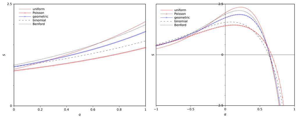 In order to illustrate the behaviour of the new index and to compare the two approaches Figure 2 depicts the entropies Sq and Sα for the uniform, Poisson (α = 2), geometric (p = 0.3), binomial (p = 0.3), and Benford probability distributions. We verify that Sq has a much smaller variation with q than Sα with α. There is a large similarity between the shape of the curves for 0 < q ≤ 1 and −0.5 < α ≤ 0. This is natural since Sq tends to the traditional entropy when q → 1, while Sα tends to the traditional entropy when α → 0. Furthermore, we verify that Sα has maxima for 0.07 < α < 0.23 and reaches null values for 0.62 < α < 0.68. Therefore, in a practical application we can adopt values for α in the first range if information is reliable, or we can consider values of α in the second range if data contains misleading information.
