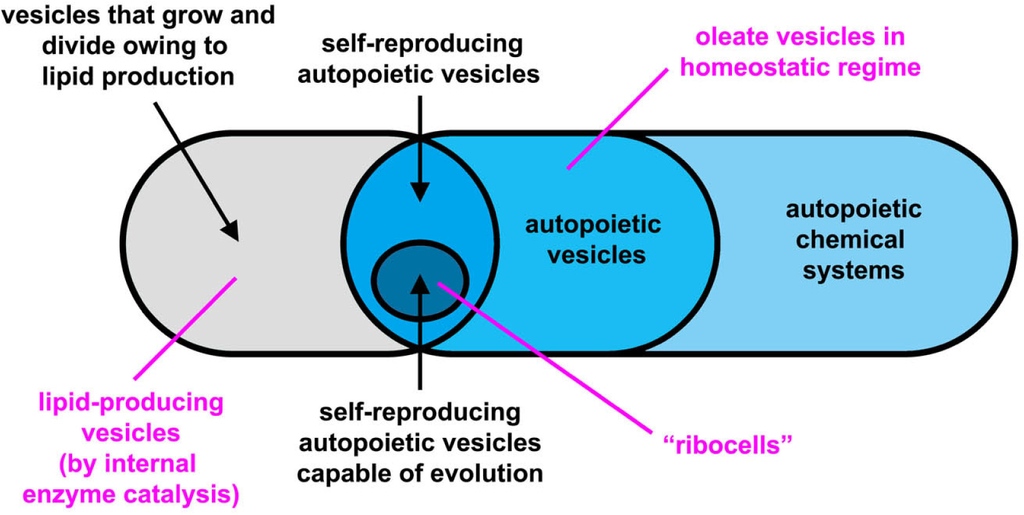 - Mavelli, F.; Stano, P. Kinetic models for autopoietic chemical systems role of fluctuations in homeostatic regime. Phys. Biol 2010, 7, 016010. [Google Scholar]