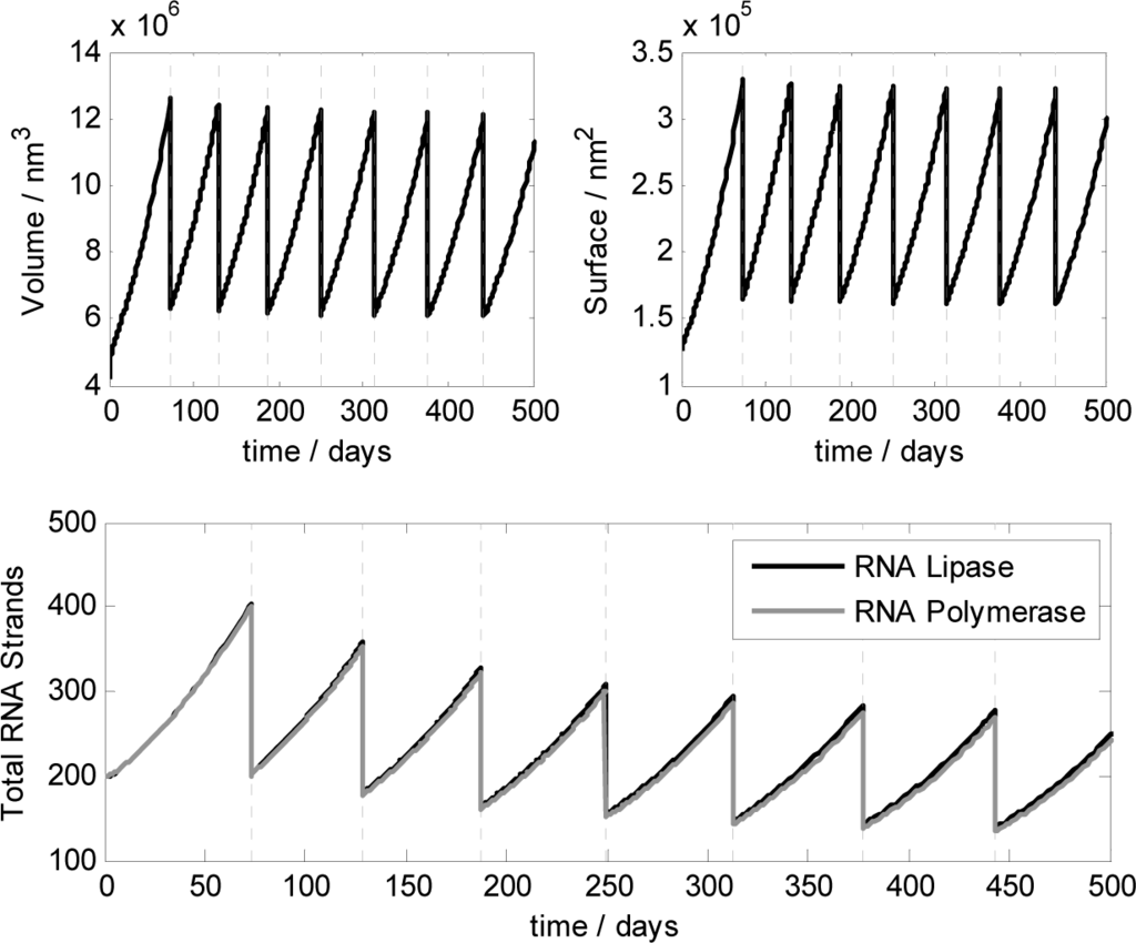Thanks to a deterministic analysis [44,45], we showed that if the kinetic constant for lipid formation kL is in the range: 1.7·103 s−1M−1 ≤ kL ≤ 1.7·105 s−1M−1 then synchronization between vesicle reproduction and genome replication can spontaneously emerge under the model assumptions and kinetic parameters reported in Table 1. Deterministic calculations were performed for two ribozymes 20 bases long and showed that the ribocell reaches a stationary growth and division regime (γ = 1), where the cell size remains constant after each division along with the amount of genetic material. Although the observed cell life time stabilizes after the first 10 generations, it remains very high (about 80 days for all the kL values in the synchronization range), making the ribocell very hard to implement and study experimentally. Therefore, we investigated the robustness of the stationary growth and division regime of the ribocell in terms of the external substrate concentrations, vesicle size and initial ribozyme amount in order to define optimal external conditions for ribocell self-reproduction [33]. The influence of ribozyme length was also explored in the optimal external conditions by varying strand size from 20 to 200 bases in length and keeping all the other kinetic parameters constant. An RNA length of 20 bases is in fact the minimum length required to observe a folded RNA structures, i.e. a structure that can reasonably exhibit catalytic action. On the other hand, entities of about 200 nucleotides have been suggested as plausible ancient proto-ribosomes [46] even though, more recently, smaller subunits of 60 nucleotides have also been considered as plausible candidates [47]. Therefore, setting the RNA length of both ribozyme pairs to 100 bases, the deterministic analysis shows that starting from external concentrations [NTP]Ex = [P]Ex = 10−2M at the stationary regime the ribocell radius is 113.0 nm and the division time reduces to 68.2 days. The total number of RNA strands is 258 and the genome composition is quite uniform 25.2% (RL), 25.2% (cRL) 25.6% (RP), 24.0% (cRP). The stationary division regime can be reached starting from initial genome composition ranging from 1 to 100 dimers of RcRL and RcRP. In Figure 10, the deterministic time behaviour of the ribocell in optimal external conditions is reported.