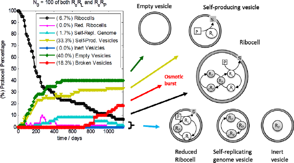 In conclusion, the simulation outcomes show that ribocells are not robust enough to survive to random fluctuations. In fact only about the 5%–7% of the initial population survive as full ribocells after 15–25 generations and on a longer time frame they too are destined for extinction. Furthermore, the time course of each single protocell is also greatly influenced by intrinsic stochasticity in particular by the time fluctuations of the RNA dimer dissociation. In fact, when all the RNA strands are associated in dimers, protocells remain in a dormant phase, whereas free RL monomers induce fast growth and division steps and free RP filaments cause the fast RNA replication without changing the vesicle size appreciably. Therefore these two processes are synchronized only by chance and this also represents a reason of weakness of this model protocell. To improve this behaviour, one possibility could be to increase the working temperature in order to facilitate the dimers dissociation and increase the concentration of the free catalysers RL and RP. For further details the reader is addressed to [33,44–45].