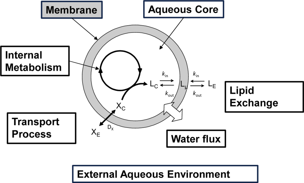 where kρ is the kinetic constant. It is worthwhile to stress that the ODE set in Equation (6) has been written for the case of aggregates formed by a single type of lipid XL. Others simplifying assumptions include: (i) the molecular diffusion of species both within the internal core volume and in the external environment are neglected; and (ii) the external concentrations [Xi]Ex are considered constant in time (i.e., the environment is considered as an infinite source of external compounds and a sink to waste).