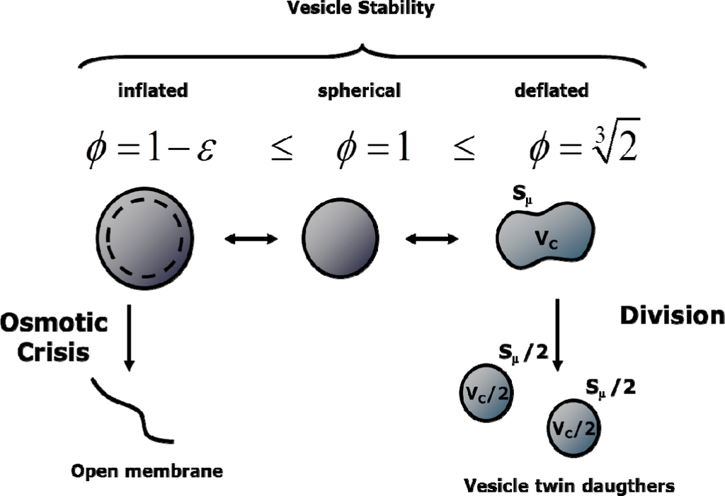 On the other hand, in the present model, deflated vesicles are assumed to divide when the membrane surface is large enough to form two twin spherical daughters: . This event has been observed under some experimental conditions [30]. However, the dynamics of a deflated vesicle are not at all trivial, and modelling the division process will become more accurate as more experimental data become available.