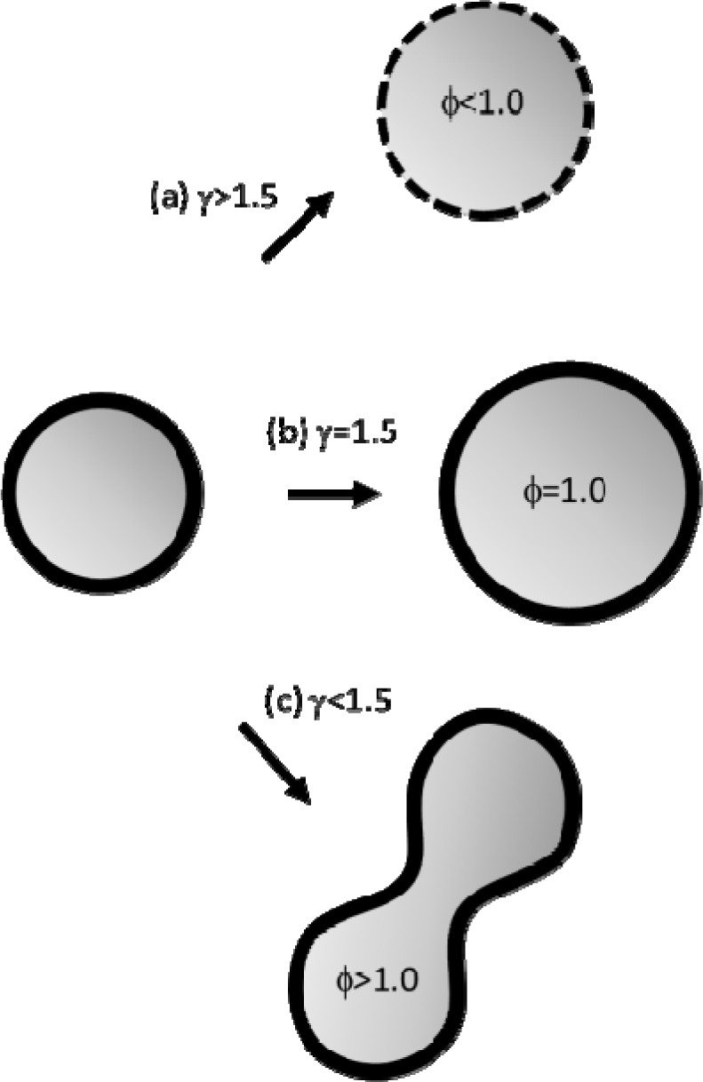 This dimensionless observable is defined as the ratio between the relative rate of volume variation, and the relative rate of surface variation. In presence of an endogenous (biosynthetic or protometabolic) production of lipid dS > 0 thanks to the spontaneous uptake of fresh lipid by the membrane and, in these conditions, γ >0 indicates a real growth regime. Therefore, just by applying some straightforward geometry rules for a generic growing sphere of radius R: d(lnV)/3 = d(lnS)/2 = d(lnR), three different scenarios among all possible growth regimes may be distinguished (Figure 4).