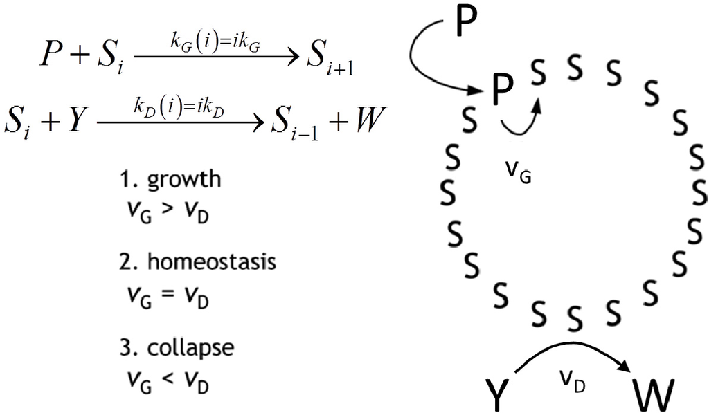 Autopoiesis, as developed by Maturana and Varela in the seventies [7], is a theoretical description of the ‘blue print’ of cellular life. It poses as a main feature the self-maintenance of the cell, as due to a process of components’ self-generation from within the cellular boundary—a boundary which is itself one of the products. From the chemical point of view, the fertility of autopoiesis theory allowed the design and the experimental achievement of some autopoietic chemical systems all based on surfactant self-assembling structures, such as micelles [10], reverse micelles [9] and vesicles [11]. In Figure 5, the schematic representation of an autopoietic vesicle is shown, along with the kinetic conditions for different regimes in the time course of total surfactant concentration. The occurrence of these regimes depends on the rates of amphiphile production vG and decay vD, respectively. Zepik et al. [12] have reported experimental work that confirms the expected behaviour. In particular, the chemical system consists of a solution of oleic acid/oleate vesicles (Si, i being the aggregation number), buffered at pH 8.8, fed with a surfactant precursor and with a reactant capable of destroying oleic acid. The surfactant precursor (P) is oleic anhydride, a hydrophobic substrate rapidly taken up by oleate vesicles at their membranous interface. Owing to the high pH value, P is converted to oleate by alkaline hydrolysis that takes place on the membrane of vesicles. Oleate vesicles also undergo a decay process due to the simultaneous transformation of oleate molecules into 9,10-dihydroxystearate (W) by osmium tetroxide/potassium ferrocyanide oxidation (Y). The dihydroxylated compound W does not form vesicles; therefore, the consequence of the latter conversion is a stepwise vesicle collapse (death). Due to the two competitive reactions, the overall oleate concentration increases, remains approximately constant, or decreases, depending on the magnitude of the P and Y flux rates [12]. In order to reproduce the experimental observed behaviour we proposed the simple mechanism reported on the right side of Figure 5 and we were able to obtain the time course of the overall oleic acid concentration [35]:
