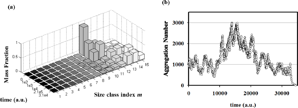 By performing simulations of autopoietic vesicle populations (each characterized by a specific vesicle size), it has been demonstrated that stochasticity selects vesicles with aggregation numbers in the range 103–104 (Figure 6a). This effect can be ascribed to the presence of random fluctuations in the growth and decay specific rates. In real (chemical) reacting systems these fluctuations are due to the intrinsic stochasticity of reacting events, but they can also be enlarged by natural changes of physical parameters such as temperature, molecular fluxes, etc. In fact, stochastic simulations starting from a single aggregate have shown how random fluctuations at the steady state can drive the evolution of the aggregate towards growing or a decreasing in size (Figure 6b). Therefore, when autopoietic vesicles of different sizes are present in a system in stationary conditions, fluctuations can act as a selection rule that leads to the perpetuation of those aggregates large enough to overcome large deviations In conclusion, stochastic simulations have shown that, in this landscape, random and driven fluctuations can represent the driving force for aggregates evolution, growth or decay, and at the same time they can act as a selection rule for the fittest, i.e. the most robust, aggregates in a prebiotic environment.