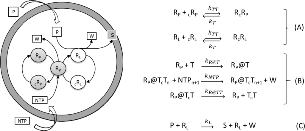 The so-called ribocell (RNA-based cell) is a theoretical minimal cell model based on a self-replicating minimum RNA genome coupled with a self-reproducing lipid vesicle compartment that has been recently hypothesized [36]. This model supposes the existence of two ribozymes, one (the lipid synthase RL) able to catalyse the conversion of molecular precursors (P) into lipids (S) and the second (the polymerase RP) able to replicate RNA strands by a template driven elongation. Therefore, in an environment rich in both lipid precursors (P) and activated nucleotides (NTPs), the ribocell can grow and self-reproduce if both processes, i.e. genome self-replication and membrane production are somehow synchronized, leading to a sustainable and recursive growth and division dynamics. Recently we have explored the feasibility of this hypothetical minimal cell [33] by determining the best external conditions to observe synchronization between genome self-replication and vesicle membrane reproduction, making use of a deterministic kinetic analysis, while the ribocell robustness to random fluctuations has been tested by stochastic simulations. The proposed metabolic mechanism is reported in Figure 9. Both pairs of RNA strands reversibly associate (A). The association is shifted towards the dimer formation and is strongly dependent on temperature. The replication of every RNA strand is catalysed by the polymerase RP according to the steps in bracket (B). This process is described as a catalytic template-directed addition of mononucleotides with high fidelity and processivity. It starts with RP binding any of the monomeric templates T (T=RP, cRP, RL and cRL) to form the complex R@T. This complex will then initiate the polymerization of the conjugate strand cT, by iteratively binding NTPs by means of specific Watson-Crick interactions, joining the nucleotides together to form the novel RNA strand cT, and releasing the by-product W. When the strand cT has been completely formed, the polymerase ribozyme releases the new dimer. Finally, the ribozyme RL catalyses the conversion of the precursor P into the lipid S (C). All the kinetic constants have been estimated by experimental values reported in literature and are listed in Table 1 along with references [38–43].