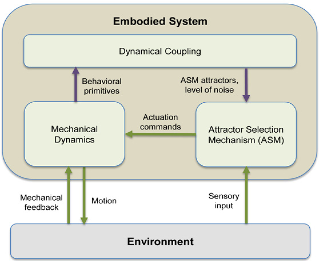 In order to understand how inherent stochastic dynamics can drive the behaviors of living beings and artificial systems like robots, it must however be noted that they are embodied systems, i.e., systems with mechanical bodies and physically embedded in the environment [21]. The behaviors of embodied system cannot be seen as merely the outcome of internal control structures, e.g., brain and central nervous system in biological systems. However, they are also affected by both the ecological niche where the system is physically embedded and the morphology, i.e., shape, size and material properties, of the system. In other words, behaviors of embodied systems must be seen as results of self-organization among the internal control structure, the body and the environment [21–24]. In fact, the emergence of distinguishable behaviors depends on the interaction among these three components [24]. Therefore, to guide the self-organizing behaviors of an embodied system towards desirable ones, the dynamics of the central control structure must be coupled with the mechanical dynamics of the body, resulting from the interaction with the environment.