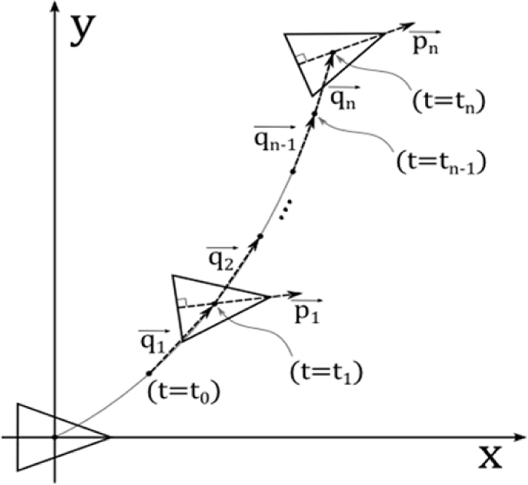 As mentioned in the Introduction, in this manuscript, we will demonstrate the proposed GSO enables the robot to perform a simple case of goal-directed locomotion. Therefore, we also build a simple model to describe the robot motion in two dimensional Cartesian space, i.e., the x-y plane. The model is shown in Figure 3. Here, is a vector which represents the robot’s orientation at time i. is therefore a unit vector whose angle is defined as ϕi. As also shown in the figure, is a displacement vector of the robot between time i-1 and i. The magnitude and angle of the vector is defined as Di and θi. The definition of the two vectors is shown in Equations (8) and (9):