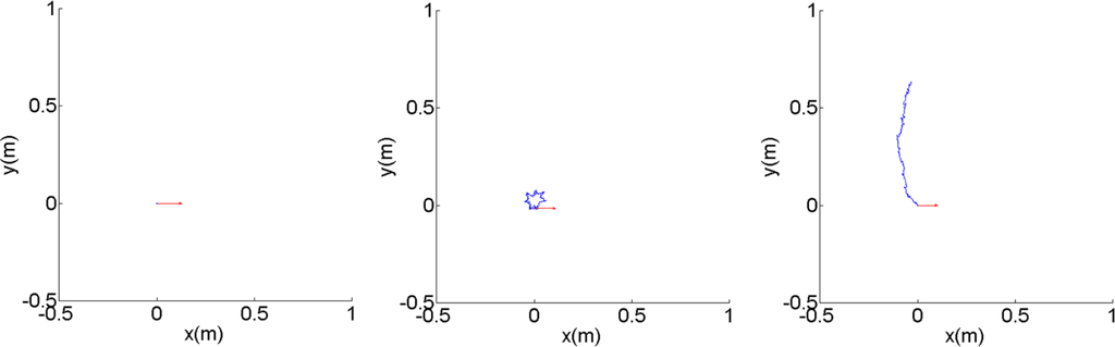 The experimental results can be summarized by Figures 8‒10. At first, we observe how different behaviors can be achieved by simply changing the level of inherent stochatic perturbation, i.e., the size of noise ε(t) defined as its standard deviation (σ(ε(t)). Figure 8 shows how the motor frequency, i.e., ω (in rad/s), changes over time along with the corresponding robot trajectory on the xy plane with different noise level. Here, ω(t) starts from the bottom of the first attractor. The arrows at the trajectories show the robot orientation, sampled every 50 s. By observing Figure 8a, it can be seen that for σ(ε(t)) = 50, ω(t) will fluctuate around the first attractor, causing the robot to explore the environment at low travelling speed while changing its directions randomly. From Figure 8b, it can be seen that at a higher noise level, i.e., (σ(ε(t)) = 100), the robot starts to be able to perform another type of behavior explained in Section 3, which is moving at higher speed while having more tendency to keep its direction.